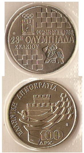 Συλλεκτικό νόμισμα των 100 δραχμών ,για την 28η Ολυμπιάδα σκακιού που έγινε στην Θεσσαλονίκη το 1988.